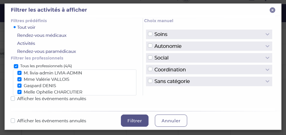 Par défaut tous les professionnels rattachés à l’établissement seront affichés, mais il sera possible d’adapter la liste en fonction du filtre disponible via le bouton “filtrer”.